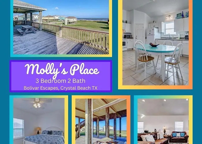 **Welcome to Molly's Place By Bolivar Escapes, a coastal retreat where serenity meets luxury.** Nestled next to the tranquil shores of Crystal Beach, this picturesque escape provides an idyllic setting for vacationers seeking relaxation. With easy access to stunning beachfront views, guests can bask in the sun or enjoy water-based activities just steps away from their accommodations.
